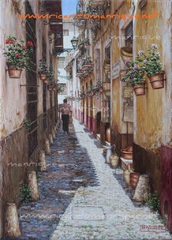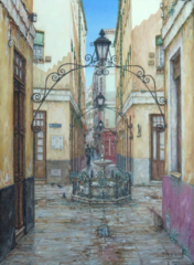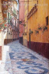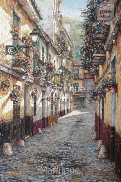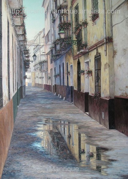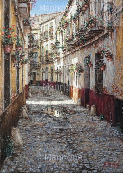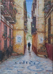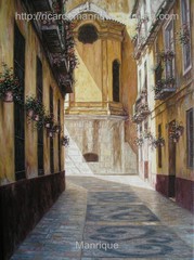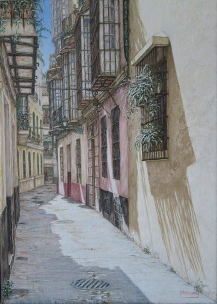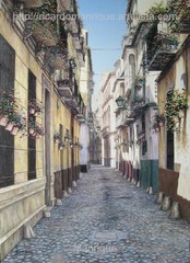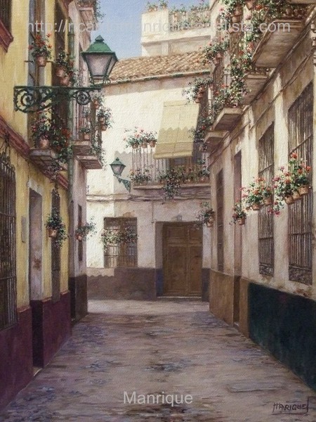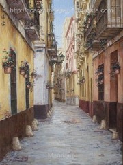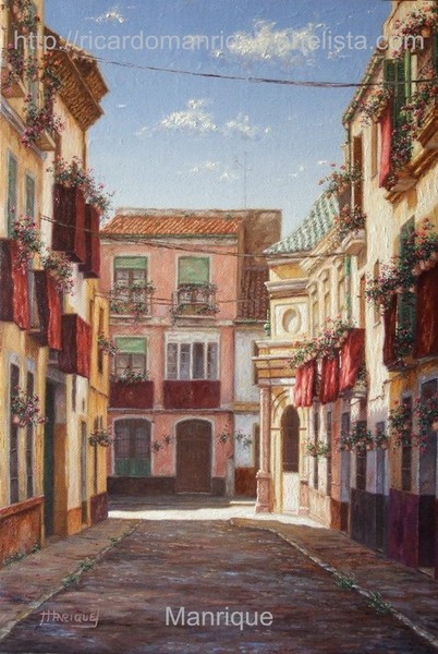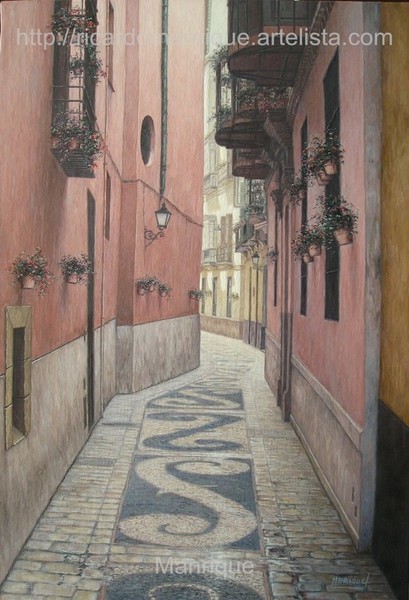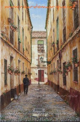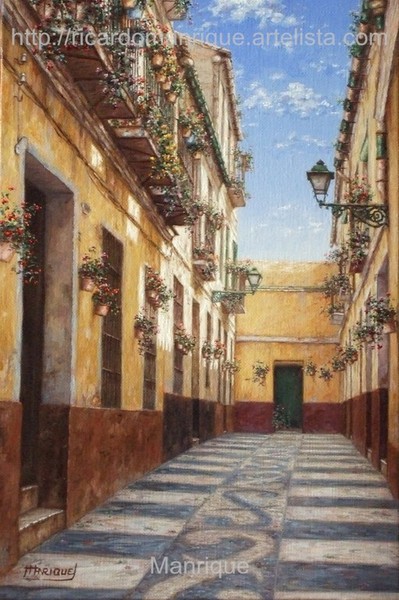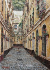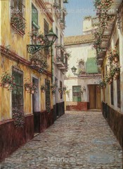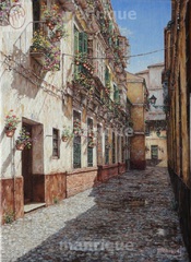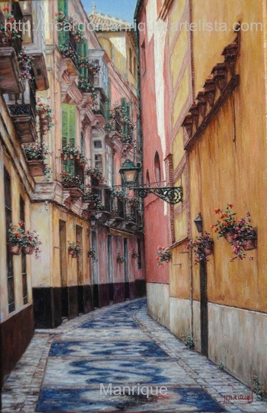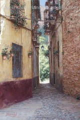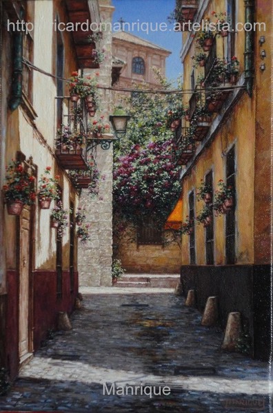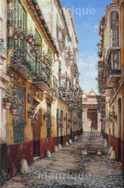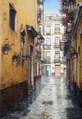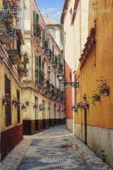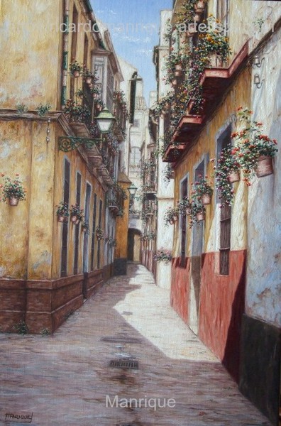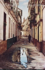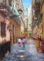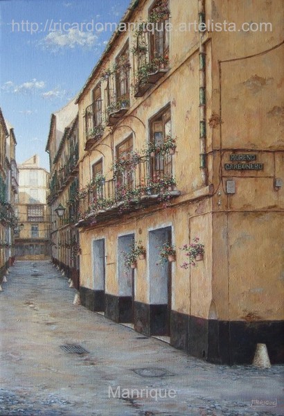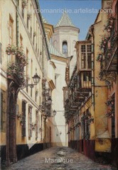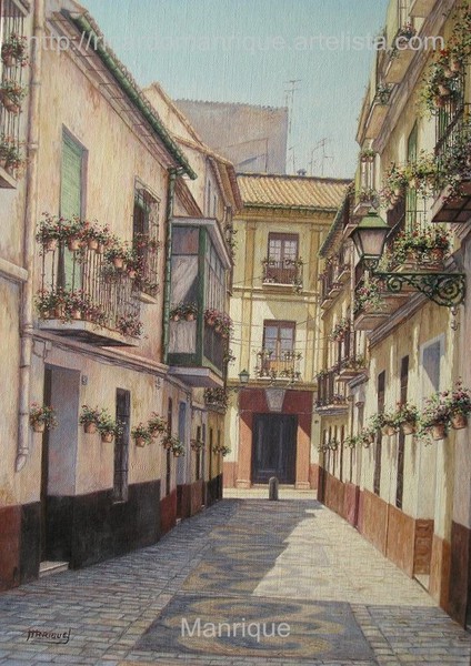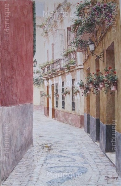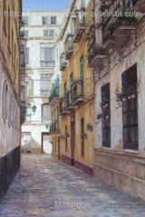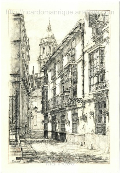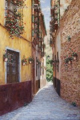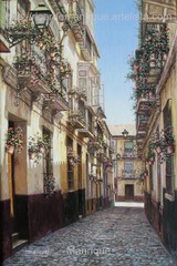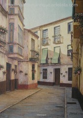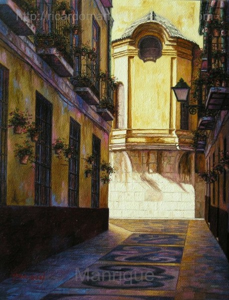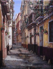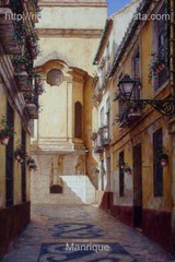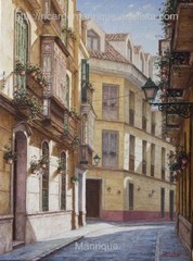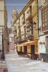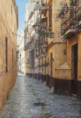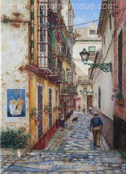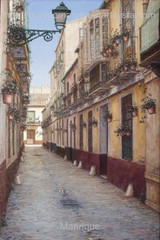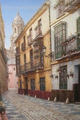 Cae la tarde de añil dorado y se encienden las farolas y los visillos de las ventanas, noches de terral y abanicos. Se asoman los jazmines y las damas de noche emborrachan el aire, calido y espeso...... de rosa y amarillo anochece en Málaga.